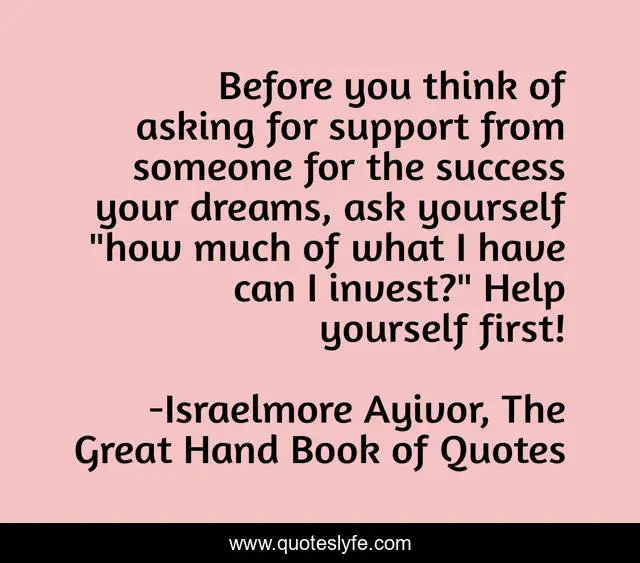 This page presents the quote "Before you think of asking for support from someone for the success your dreams, ask yourself "how much of what I have can I invest?" Help yourself first!". Author of this quote is Israelmore Ayivor, The Great Hand Book of Quotes. This quote is about guide, know-yourself, food-for-thought, help, success, successful, invest, support, yourself,.