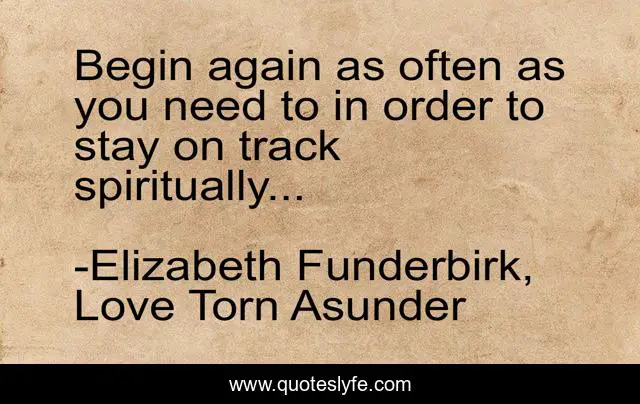 This page presents the quote "Begin again as often as you need to in order to stay on track spiritually...". Author of this quote is Elizabeth Funderbirk, Love Torn Asunder. This quote is about quote, spiritual, encouragement, inspirational, enthusiasm,.