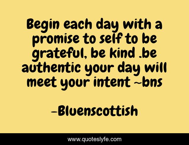 This page presents the quote "Begin each day with a promise to self to be grateful, be kind .be authentic your day will meet your intent ~bns". Author of this quote is Bluenscottish. This quote is about gratitude, confidence, success, positive, leadership, bluenscottish, promise, authentic,.