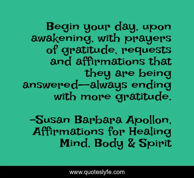 "Susan Barbara Apollon, Affirmations for Healing Mind, Body & Spirit Quotes." Quoteslyfe.com, 2025. Sun. 07 Dec. 2025. <https://www.quoteslyfe.com/quote/Begin-your-day-upon-awakening-with-prayers-114622>.