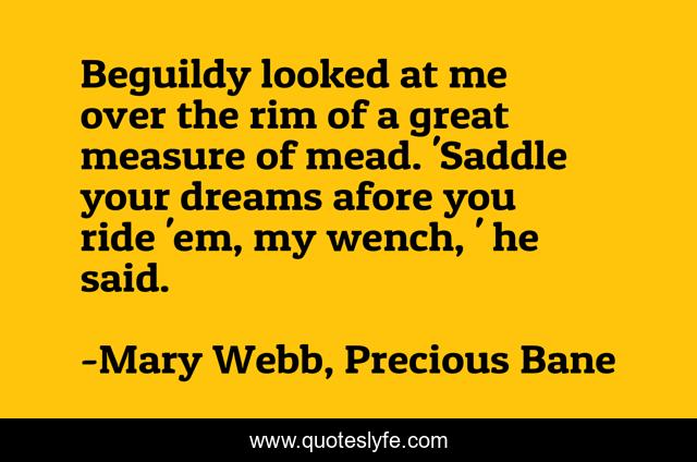 This page presents the quote "Beguildy looked at me over the rim of a great measure of mead. 'Saddle your dreams afore you ride 'em, my wench, ' he said.". Author of this quote is Mary Webb, Precious Bane. This quote is about mead, dreams, dreaming,.