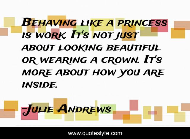 This page presents the quote "Behaving like a princess is work. It's not just about looking beautiful or wearing a crown. It's more about how you are inside.". Author of this quote is Julie Andrews. This quote is about beautiful, looking, princess,.