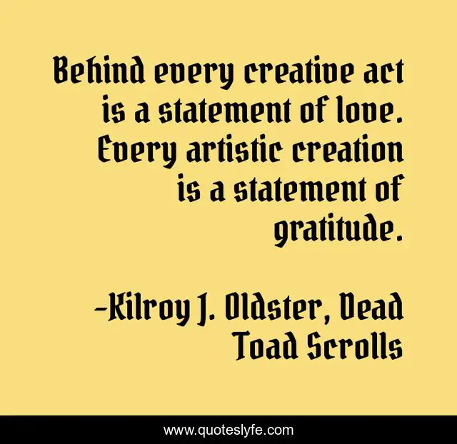This page presents the quote "Behind every creative act is a statement of love. Every artistic creation is a statement of gratitude.". Author of this quote is Kilroy J. Oldster, Dead Toad Scrolls. This quote is about gratitude, art, creativity-and-motivational, gratefulness, creativity, creativity-and-attitude, artists,.
