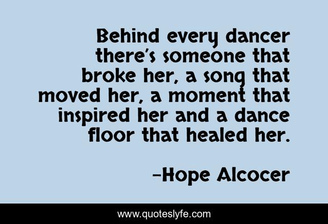 This page presents the quote "Behind every dancer there’s someone that broke her, a song that moved her, a moment that inspired her and a dance floor that healed her.". Author of this quote is Hope Alcocer. This quote is about baggage, broken, dancer, dancing, healing-the-past,.
