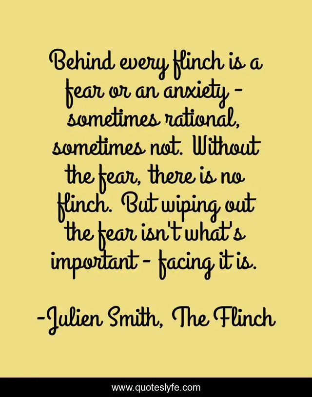 This page presents the quote "Behind every flinch is a fear or an anxiety - sometimes rational, sometimes not. Without the fear, there is no flinch. But wiping out the fear isn't what's important - facing it is.". Author of this quote is Julien Smith, The Flinch. This quote is about anxiety, irrational, afraid, courage, rational, fear, flinch, courageous, facing-fear,.