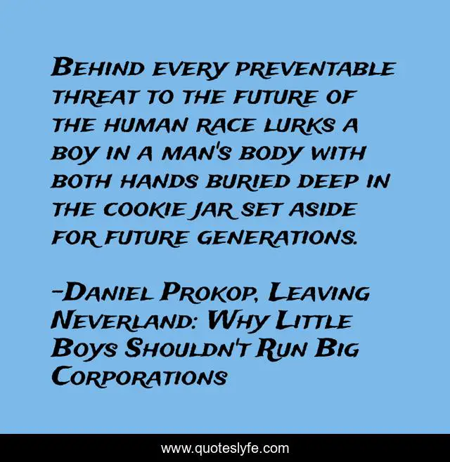 This page presents the quote "Behind every preventable threat to the future of the human race lurks a boy in a man's body with both hands buried deep in the cookie jar set aside for future generations.". Author of this quote is Daniel Prokop, Leaving Neverland: Why Little Boys Shouldn't Run Big Corporations. This quote is about leaving-neverland, satire, future-eaters, rites-of-passage, little-boys,.