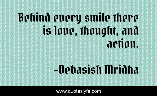 This page presents the quote "Behind every smile there is love, thought, and action.". Author of this quote is Debasish Mridha. This quote is about behind-every-smile, love, philosophy, debasish-mridha, thought, quotes, affection, inspirational, smile,.