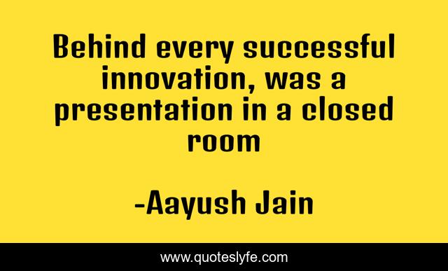 This page presents the quote "Behind every successful innovation, was a presentation in a closed room". Author of this quote is Aayush Jain. This quote is about world-changing-ideas, thinkers, success, great-innovators, great-ideas, innovation, leadership, idea-thinkers, innovators,.