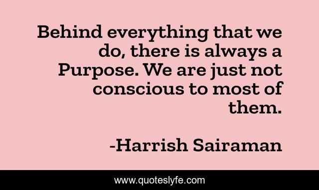 This page presents the quote "Behind everything that we do, there is always a Purpose. We are just not conscious to most of them.". Author of this quote is Harrish Sairaman. This quote is about life, conscious, purpose, motivation, inspiration,.