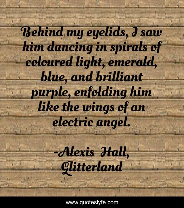 This page presents the quote "Behind my eyelids, I saw him dancing in spirals of coloured light, emerald, blue, and brilliant purple, enfolding him like the wings of an electric angel.". Author of this quote is Alexis Hall, Glitterland. This quote is about wings, angel, electric-angel,.