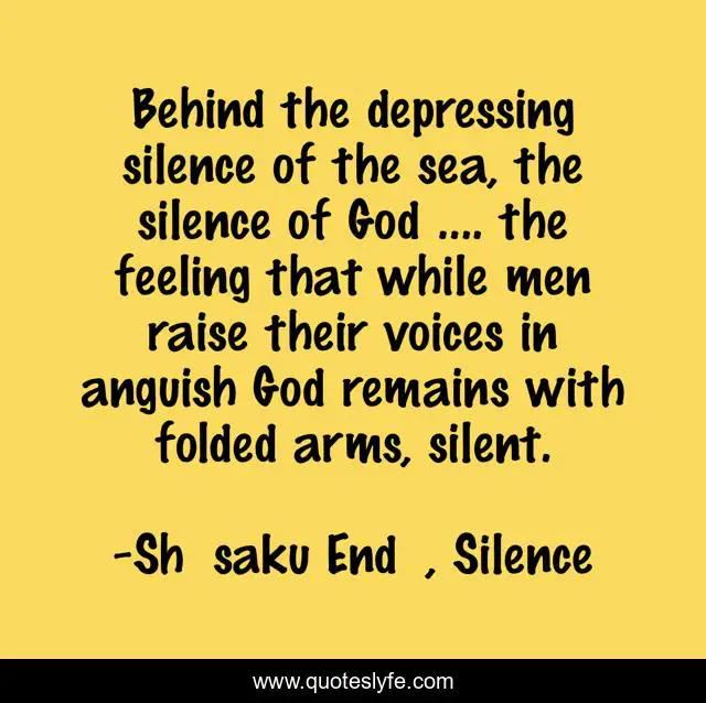This page presents the quote "Behind the depressing silence of the sea, the silence of God …. the feeling that while men raise their voices in anguish God remains with folded arms, silent.". Author of this quote is Shūsaku Endō, Silence. This quote is about god, silence,.
