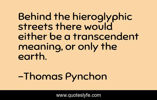 This page presents the quote "Behind the hieroglyphic streets there would either be a transcendent meaning, or only the earth.". Author of this quote is Thomas Pynchon. This quote is about emptiness, meaning, trystero, paranoia, conspiracy-theories, truth, reality,.