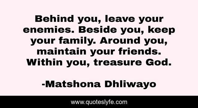 "Matshona Dhliwayo Quotes." Quoteslyfe.com, 2025. Fri. 05 Dec. 2025. <https://www.quoteslyfe.com/quote/Behind-you-leave-your-enemies-Beside-you-57660>.