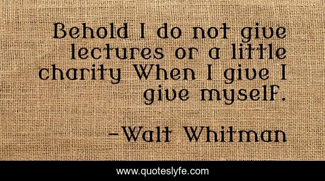 This page presents the quote "Behold I do not give lectures or a little charity When I give I give myself.". Author of this quote is Walt Whitman. .