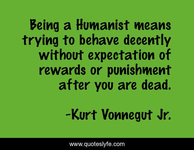 This page presents the quote "Being a Humanist means trying to behave decently without expectation of rewards or punishment after you are dead.". Author of this quote is Kurt Vonnegut Jr.. This quote is about atheism, afterlife, humanism, secularism,.