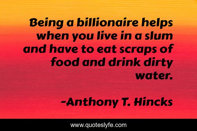 This page presents the quote "Being a billionaire helps when you live in a slum and have to eat scraps of food and drink dirty water.". Author of this quote is Anthony T. Hincks. This quote is about money, food, billionaire, philosophy, water, live, dirty, slum, scraps,.