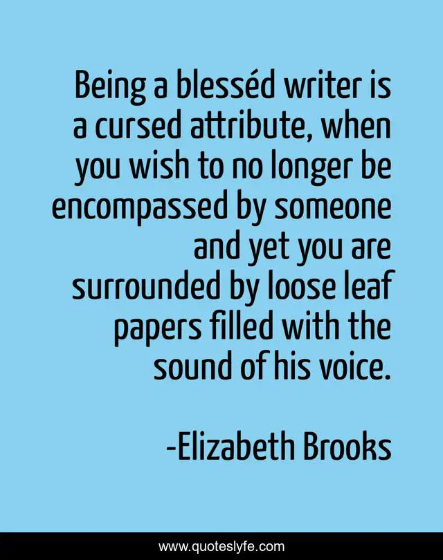 This page presents the quote "Being a blesséd writer is a cursed attribute, when you wish to no longer be encompassed by someone and yet you are surrounded by loose leaf papers filled with the sound of his voice.". Author of this quote is Elizabeth Brooks. This quote is about love, relationship, author, breakup, poetry, writing, heartbreak, affection,.
