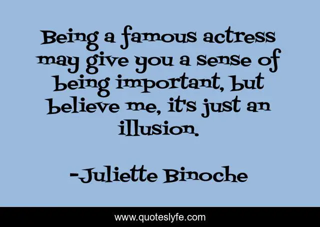 This page presents the quote "Being a famous actress may give you a sense of being important, but believe me, it's just an illusion.". Author of this quote is Juliette Binoche. This quote is about me, believe,.