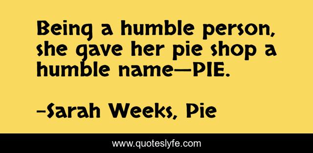 This page presents the quote "Being a humble person, she gave her pie shop a humble name—PIE.". Author of this quote is Sarah Weeks, Pie. This quote is about cooking, food, middle-grade, humble, kidlit, middlegrade, naming, humility,.