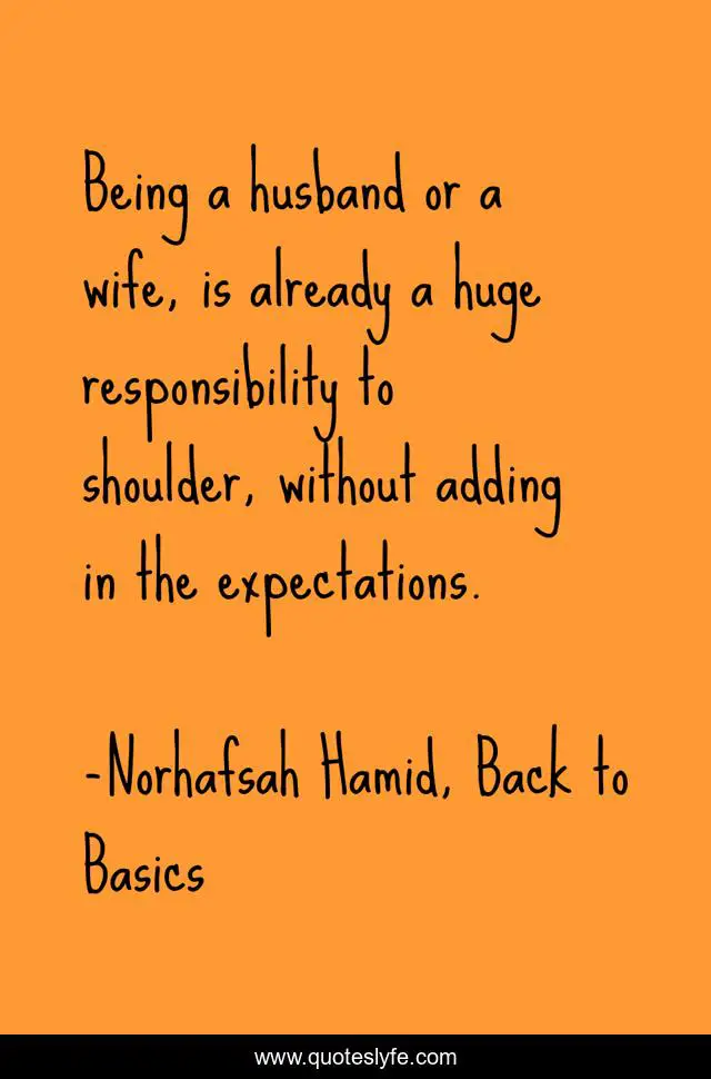 This page presents the quote "Being a husband or a wife, is already a huge responsibility to shoulder, without adding in the expectations.". Author of this quote is Norhafsah Hamid, Back to Basics. This quote is about husband-and-wife, wife, expectations, responsibilities, responsibility, husband, husbands-and-wives,.