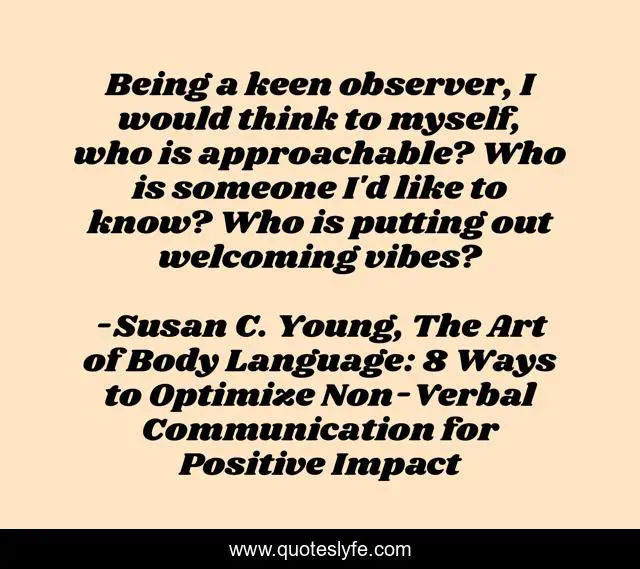 "Susan C. Young, The Art of Body Language: 8 Ways to Optimize Non-Verbal Communication for Positive Impact Quotes." Quoteslyfe.com, 2025. Sat. 06 Dec. 2025. <https://www.quoteslyfe.com/quote/Being-a-keen-observer-I-would-think-233529>.