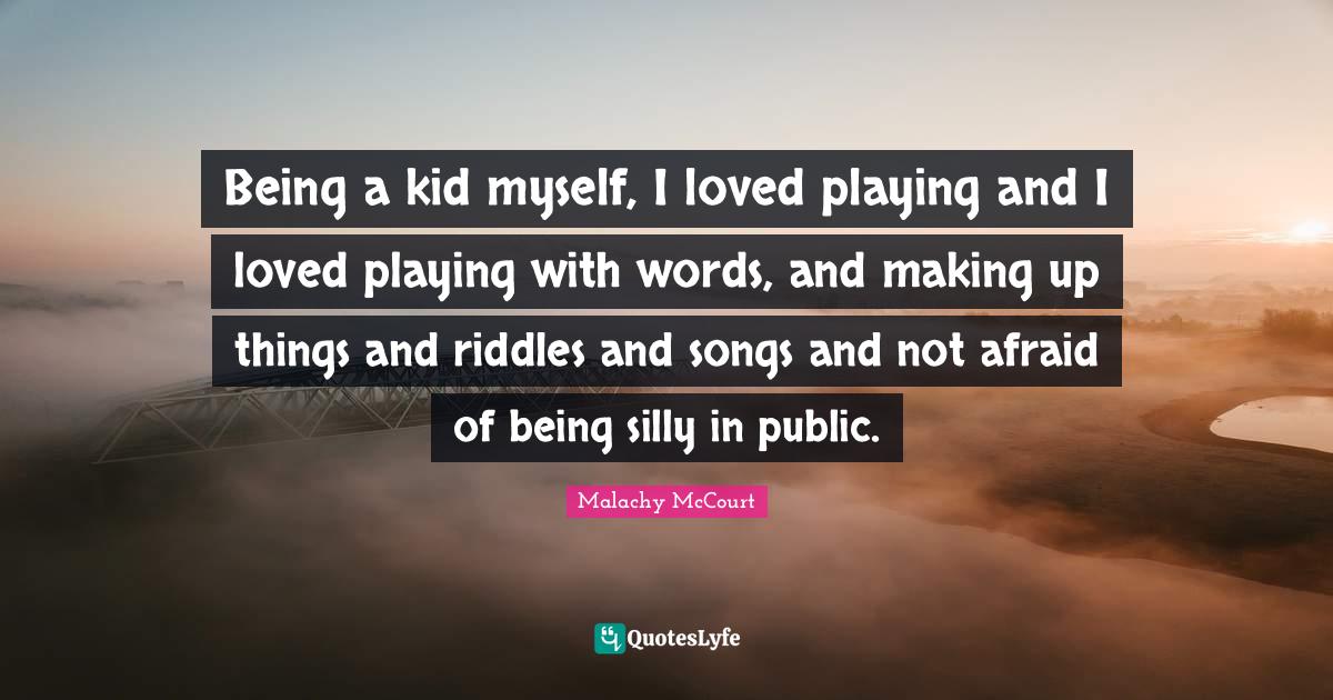 This page presents the quote "Being a kid myself, I loved playing and I loved playing with words, and making up things and riddles and songs and not afraid of being silly in public.". Author of this quote is Malachy McCourt. This quote is about making up, silly, being silly, song, being a kid, kids, not afraid,.