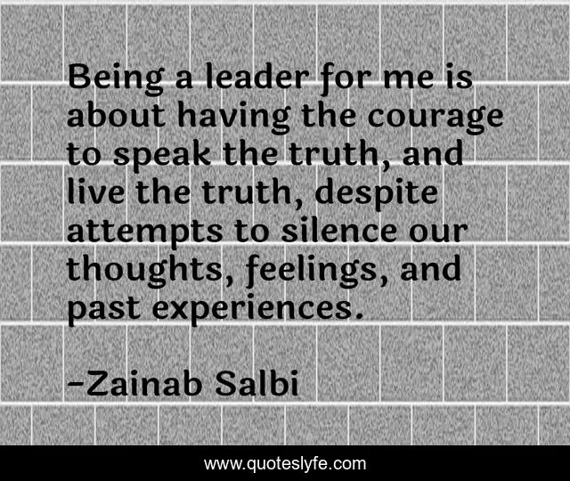 This page presents the quote "Being a leader for me is about having the courage to speak the truth, and live the truth, despite attempts to silence our thoughts, feelings, and past experiences.". Author of this quote is Zainab Salbi. This quote is about past, leader, truth,.