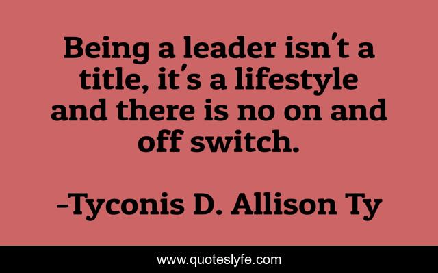 This page presents the quote "Being a leader isn't a title, it's a lifestyle and there is no on and off switch.". Author of this quote is Tyconis D. Allison Ty. This quote is about leadership, commitment,.