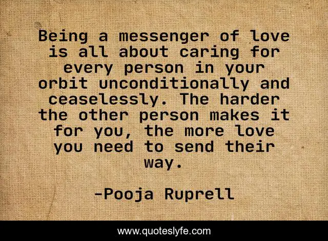 This page presents the quote "Being a messenger of love is all about caring for every person in your orbit unconditionally and ceaselessly. The harder the other person makes it for you, the more love you need to send their way.". Author of this quote is Pooja Ruprell. This quote is about perseverance, passion, prayer,.