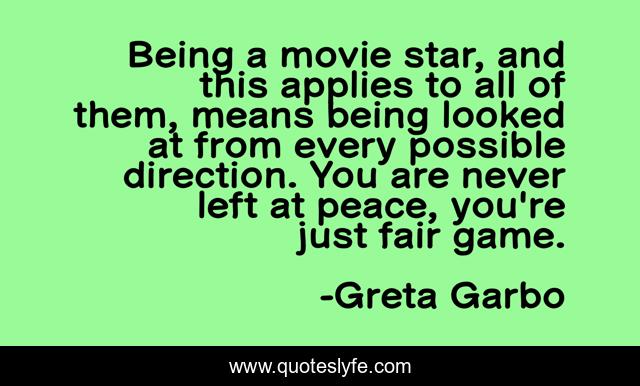 This page presents the quote "Being a movie star, and this applies to all of them, means being looked at from every possible direction. You are never left at peace, you're just fair game.". Author of this quote is Greta Garbo. This quote is about game, direction,.