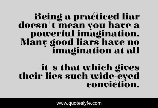 This page presents the quote "Being a practiced liar doesn't mean you have a powerful imagination. Many good liars have no imagination at all". Author of this quote is it's that which gives their lies such wide-eyed conviction.. This quote is about philip pullman, the golden compass,.