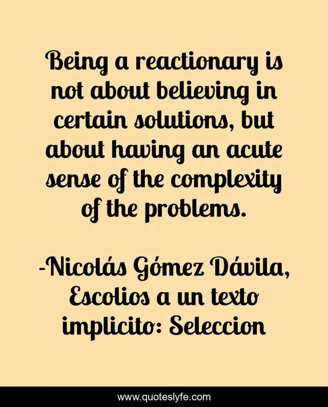 This page presents the quote "Being a reactionary is not about believing in certain solutions, but about having an acute sense of the complexity of the problems.". Author of this quote is Nicolás Gómez Dávila, Escolios a un texto implicito: Seleccion. This quote is about belief, reactionary, problems, thought, complexity, solutions, politics,.