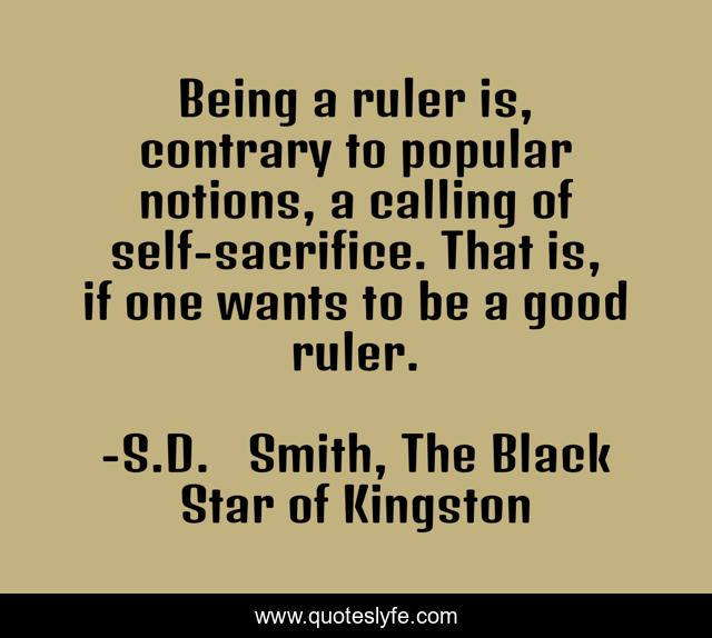 This page presents the quote "Being a ruler is, contrary to popular notions, a calling of self-sacrifice. That is, if one wants to be a good ruler.". Author of this quote is S.D. Smith, The Black Star of Kingston. This quote is about sacrifice, power,.