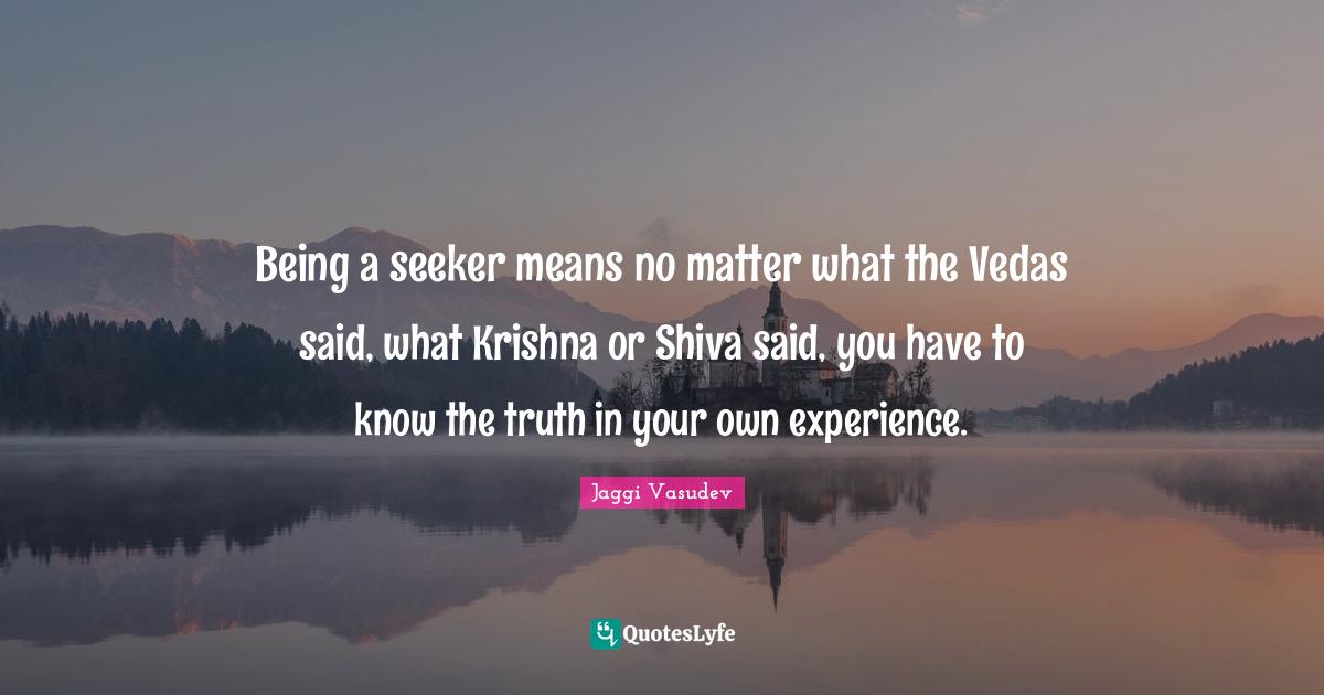 This page presents the quote "Being a seeker means no matter what the Vedas said, what Krishna or Shiva said, you have to know the truth in your own experience.". Author of this quote is Jaggi Vasudev. This quote is about krishna, shiva, spiritual, said, vedas, yoga, truth, no matter what, mean,.