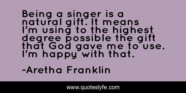 This page presents the quote "Being a singer is a natural gift. It means I'm using to the highest degree possible the gift that God gave me to use. I'm happy with that.". Author of this quote is Aretha Franklin. This quote is about me, gift, happy,.