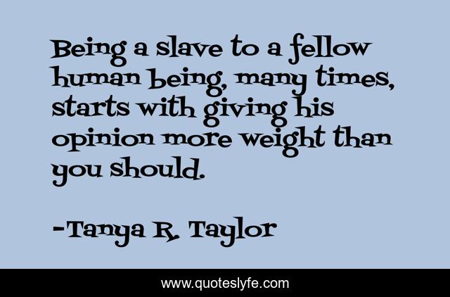 This page presents the quote "Being a slave to a fellow human being, many times, starts with giving his opinion more weight than you should.". Author of this quote is Tanya R. Taylor. This quote is about self-confidence, inspiration,.