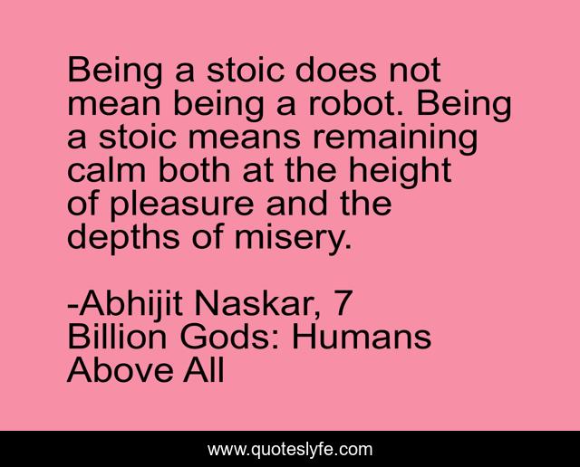 This page presents the quote "Being a stoic does not mean being a robot. Being a stoic means remaining calm both at the height of pleasure and the depths of misery.". Author of this quote is Abhijit Naskar, 7 Billion Gods: Humans Above All. This quote is about confidence, brainy, positive, motivational, stoicism, philosopher, emotions, optimistic, inspirational,.