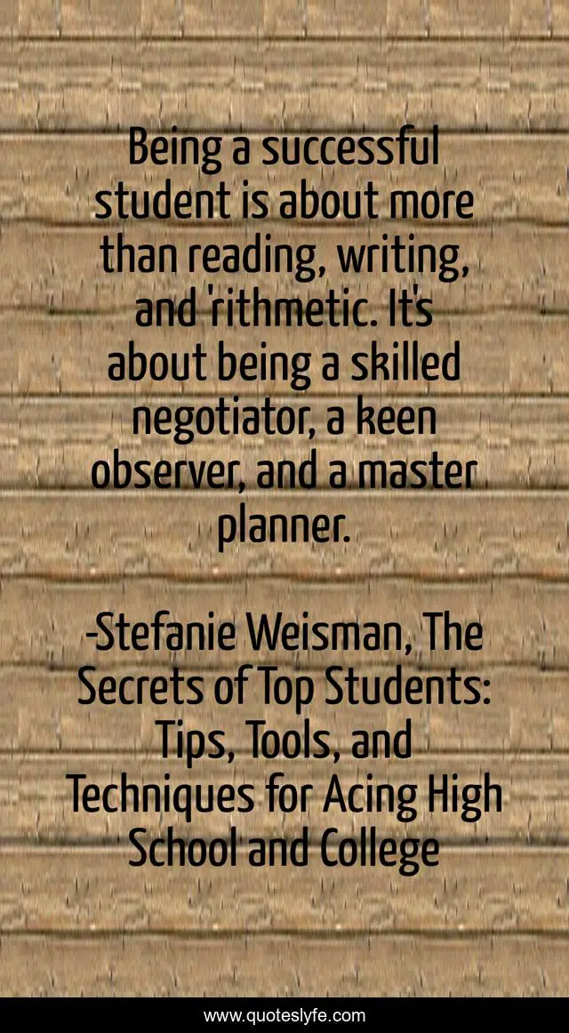 This page presents the quote "Being a successful student is about more than reading, writing, and 'rithmetic. It's about being a skilled negotiator, a keen observer, and a master planner.". Author of this quote is Stefanie Weisman, The Secrets of Top Students: Tips, Tools, and Techniques for Acing High School and College. This quote is about students, school,.