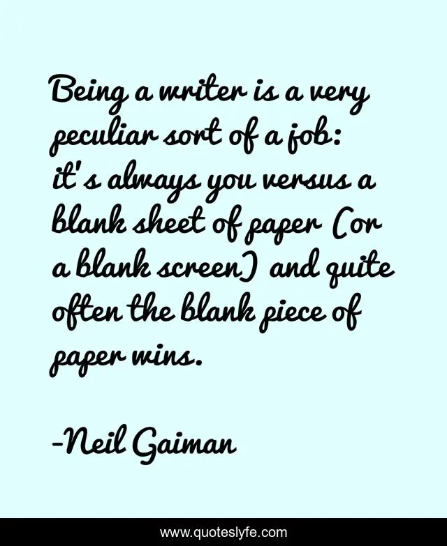 This page presents the quote "Being a writer is a very peculiar sort of a job: it's always you versus a blank sheet of paper (or a blank screen) and quite often the blank piece of paper wins.". Author of this quote is Neil Gaiman. .