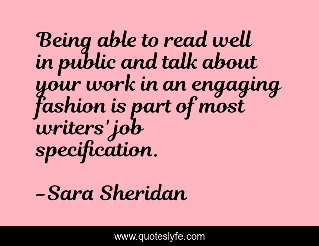 This page presents the quote "Being able to read well in public and talk about your work in an engaging fashion is part of most writers' job specification.". Author of this quote is Sara Sheridan. This quote is about job-specificaion, public-speaking, engagement, writing, talking, job, writers,.