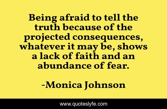 This page presents the quote "Being afraid to tell the truth because of the projected consequences, whatever it may be, shows a lack of faith and an abundance of fear.". Author of this quote is Monica Johnson. This quote is about abundance, fear, truth,.