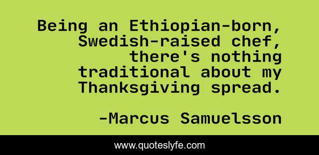 This page presents the quote "Being an Ethiopian-born, Swedish-raised chef, there's nothing traditional about my Thanksgiving spread.". Author of this quote is Marcus Samuelsson. This quote is about chef, nothing, being,.