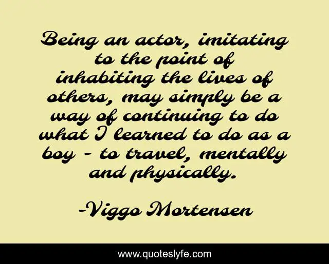 This page presents the quote "Being an actor, imitating to the point of inhabiting the lives of others, may simply be a way of continuing to do what I learned to do as a boy - to travel, mentally and physically.". Author of this quote is Viggo Mortensen. This quote is about boy, actor, way,.