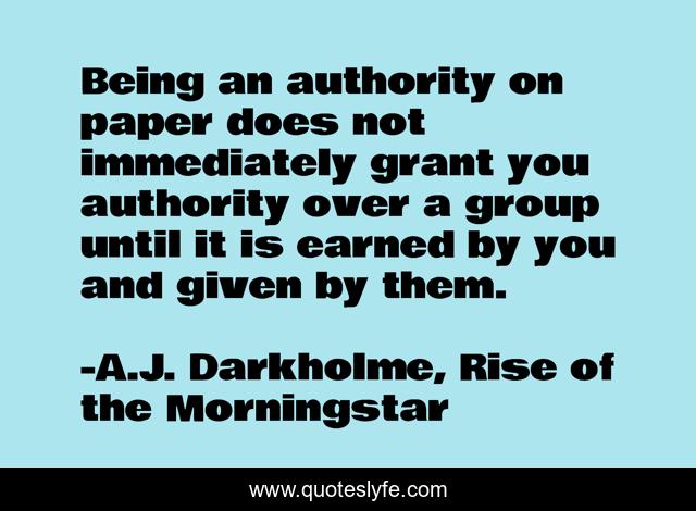 This page presents the quote "Being an authority on paper does not immediately grant you authority over a group until it is earned by you and given by them.". Author of this quote is A.J. Darkholme, Rise of the Morningstar. This quote is about paper, group, authority, leadership, teams,.