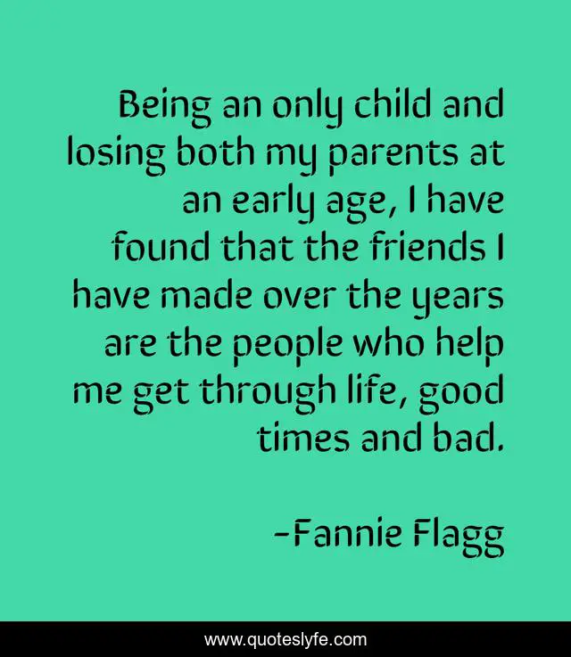 This page presents the quote "Being an only child and losing both my parents at an early age, I have found that the friends I have made over the years are the people who help me get through life, good times and bad.". Author of this quote is Fannie Flagg. This quote is about life, good, friends,.