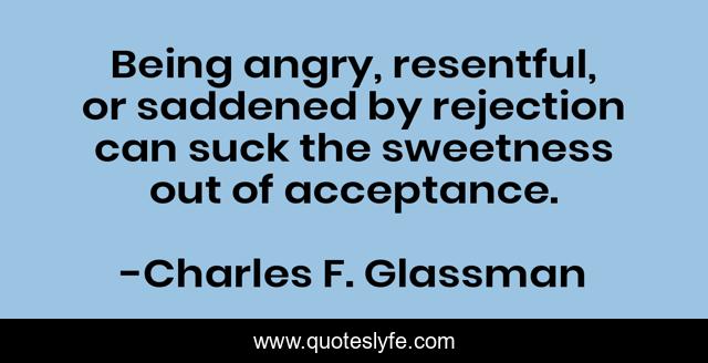 This page presents the quote "Being angry, resentful, or saddened by rejection can suck the sweetness out of acceptance.". Author of this quote is Charles F. Glassman. This quote is about confidence, acceptance, rejection, relationship, positive, motivational, optimistic, inspirational, enthusiasm,.