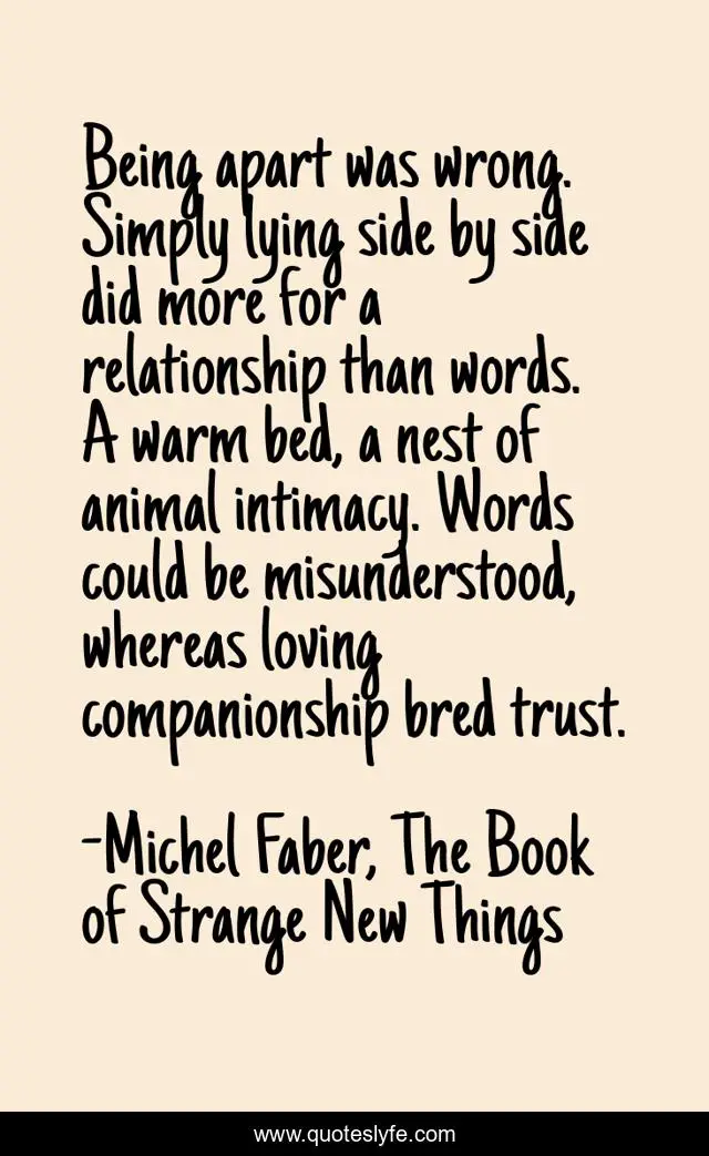 This page presents the quote "Being apart was wrong. Simply lying side by side did more for a relationship than words. A warm bed, a nest of animal intimacy. Words could be misunderstood, whereas loving companionship bred trust.". Author of this quote is Michel Faber, The Book of Strange New Things. This quote is about relationship, intimacy, love, companionship, affection,.