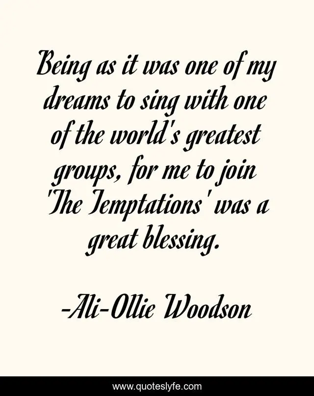 This page presents the quote "Being as it was one of my dreams to sing with one of the world's greatest groups, for me to join 'The Temptations' was a great blessing.". Author of this quote is Ali-Ollie Woodson. This quote is about me, world, great,.