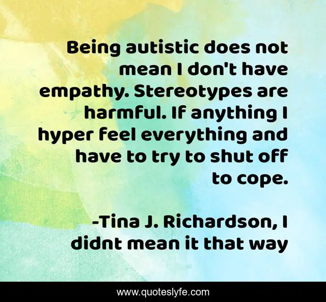 This page presents the quote "Being autistic does not mean I don't have empathy. Stereotypes are harmful. If anything I hyper feel everything and have to try to shut off to cope.". Author of this quote is Tina J. Richardson, I didnt mean it that way. This quote is about feel, empathy, aspergers, autistic, autism,.