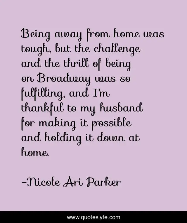 This page presents the quote "Being away from home was tough, but the challenge and the thrill of being on Broadway was so fulfilling, and I'm thankful to my husband for making it possible and holding it down at home.". Author of this quote is Nicole Ari Parker. This quote is about home, challenge, husband,.